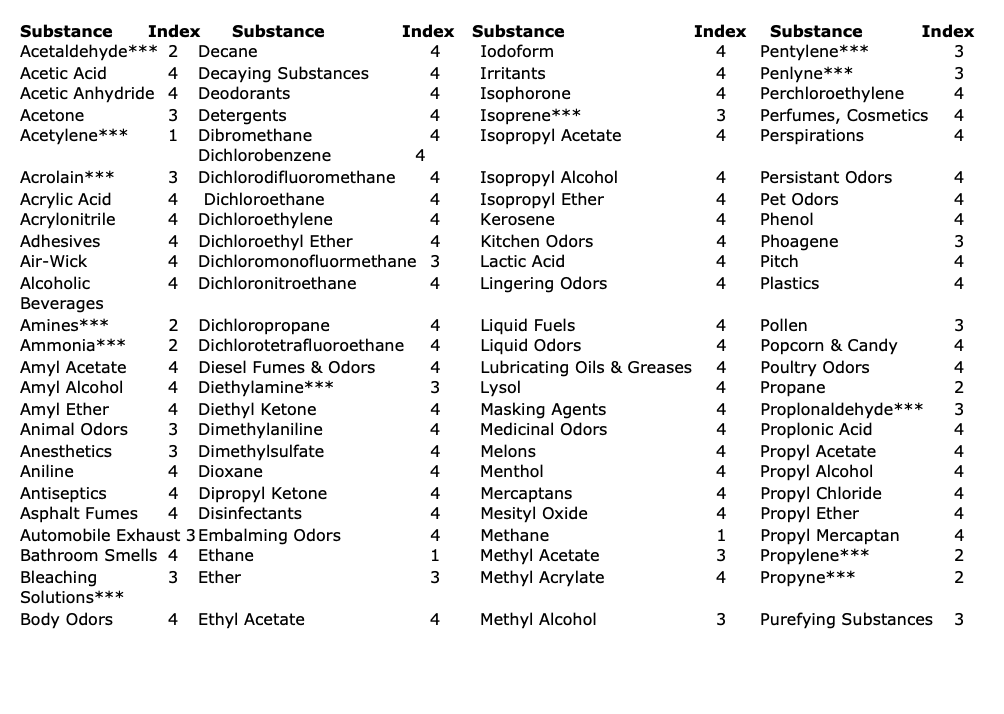 The capacity index chart lists substances by both chemical and common name. It is a general list of the most common compounds found in the workplace. The efficiency and capacity of activated carbon to adsorb these substances varies with the concentration in the air, relative humidity and temperature. The capacity index numbers are representative under average conditions and may vary under local conditions.