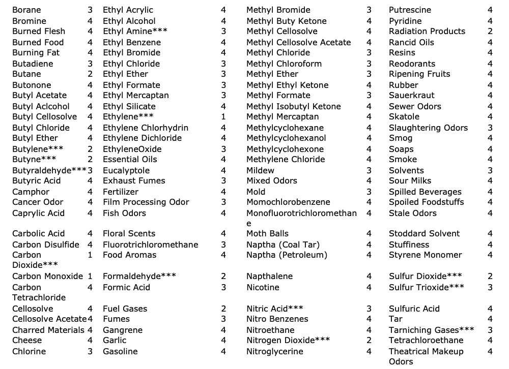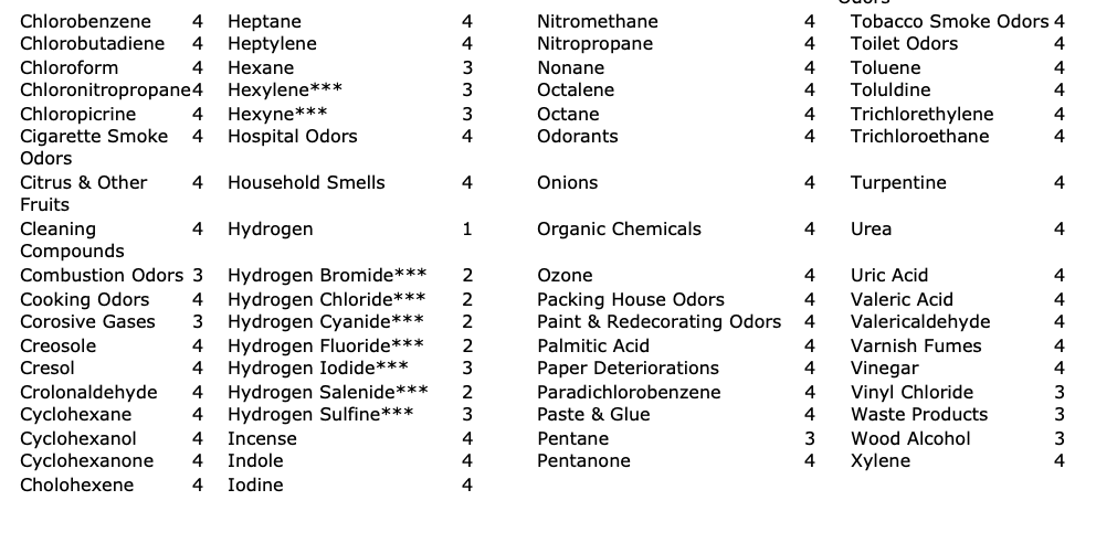 Note: Substances marked with *** are not adequately adsorbed by standard activated carbon. It is necessary to use treated (KMN) carbon to increase the adsorption efficiency.